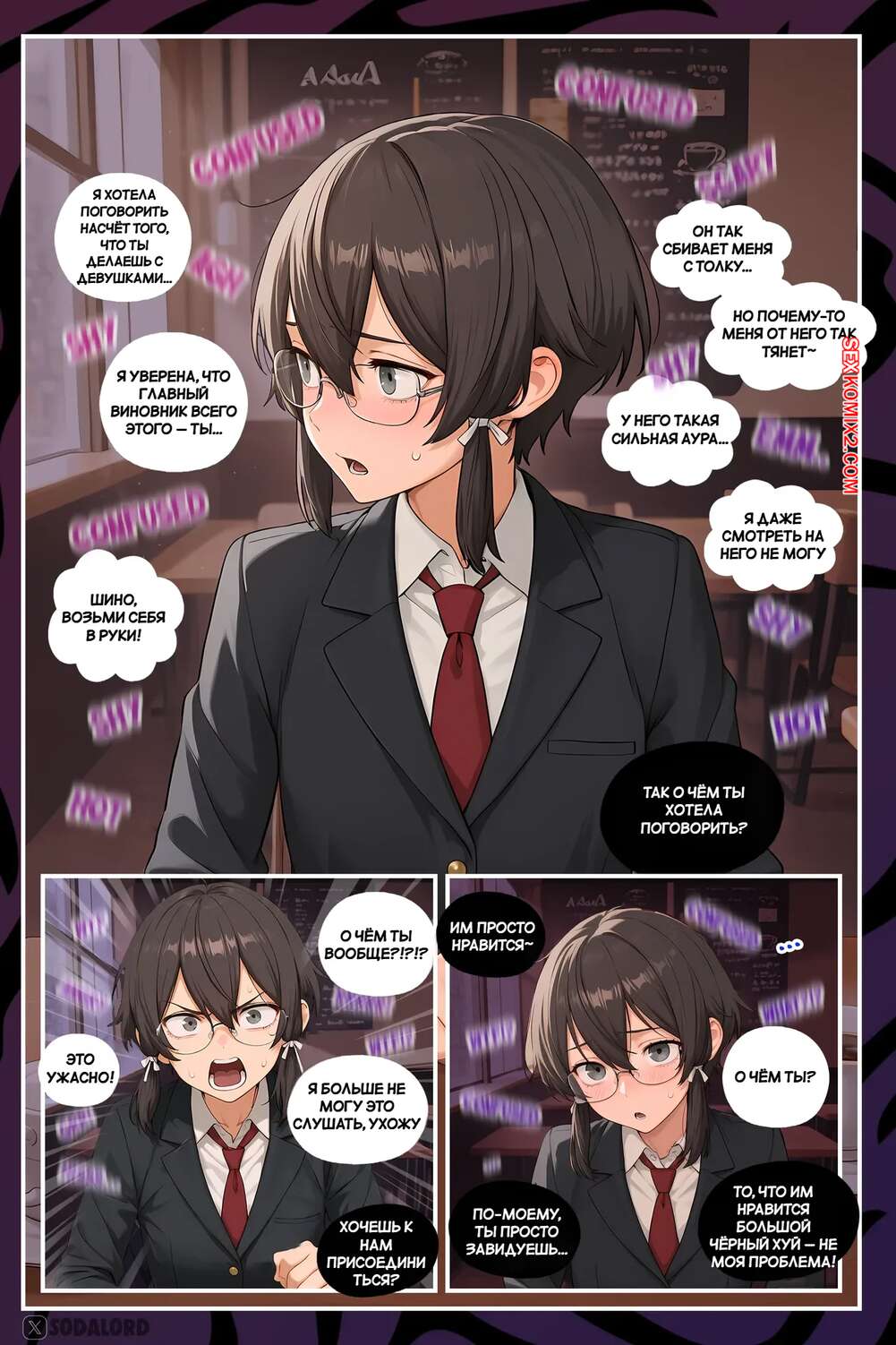 Порно комикс САО. Часть 5. Асадо Шино. SAO. Asado Shino. Sodalord. Горячая брюнетка не довольна маленьким членом своего парня и нашла себе темнокожего любовника. Он дает сучке глубоко заглотить свой хуй, после чего хорошенько ее трахает.