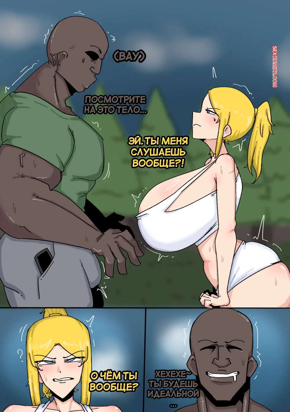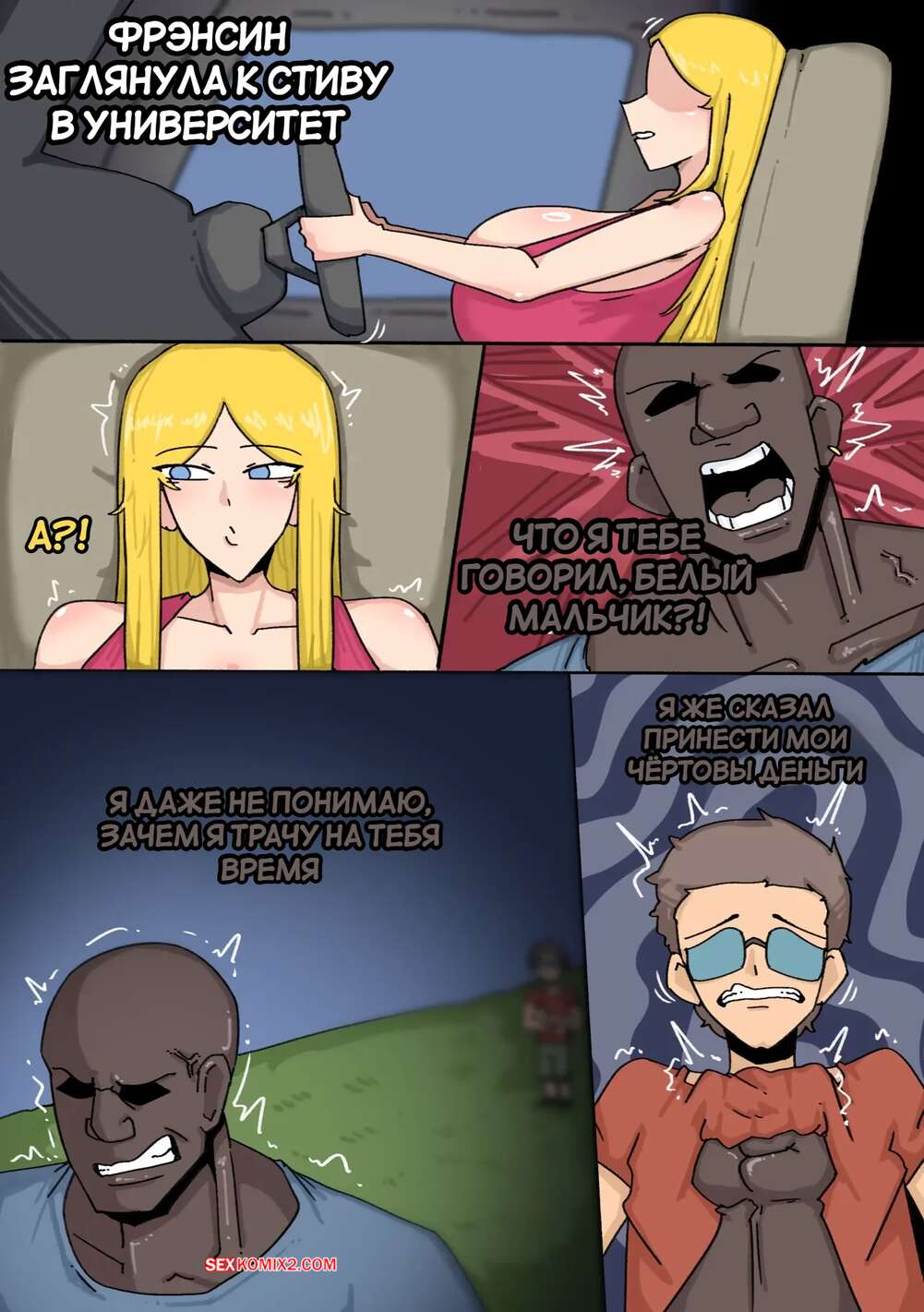 Порно комикс American Dad. Американская сука. American Bitch. ENNO. Темнокожий парень задевает Стива в универе и теперь Франсин предстоит решить этот вопрос. Красотка встречается с хулиганом и отсасывает его огромный хуй, после чего дает ему и его дружку выебать себя во все дырочки.